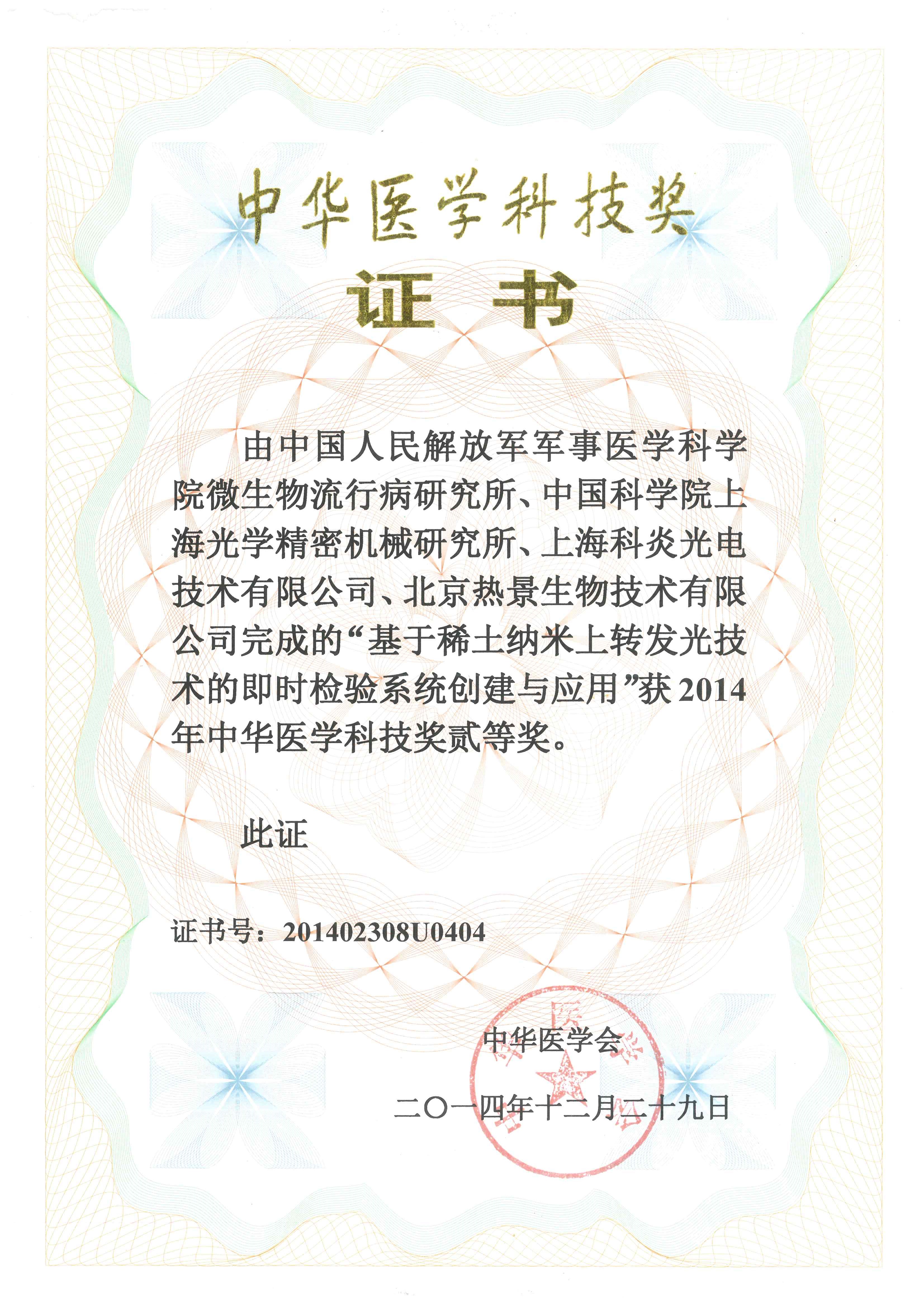 由北京熱景生物技術有限公司參與完成的“基于稀土納米上轉發光技術的即時檢驗系統創新與應用”榮獲2014年中華醫學科技獎貳等獎。