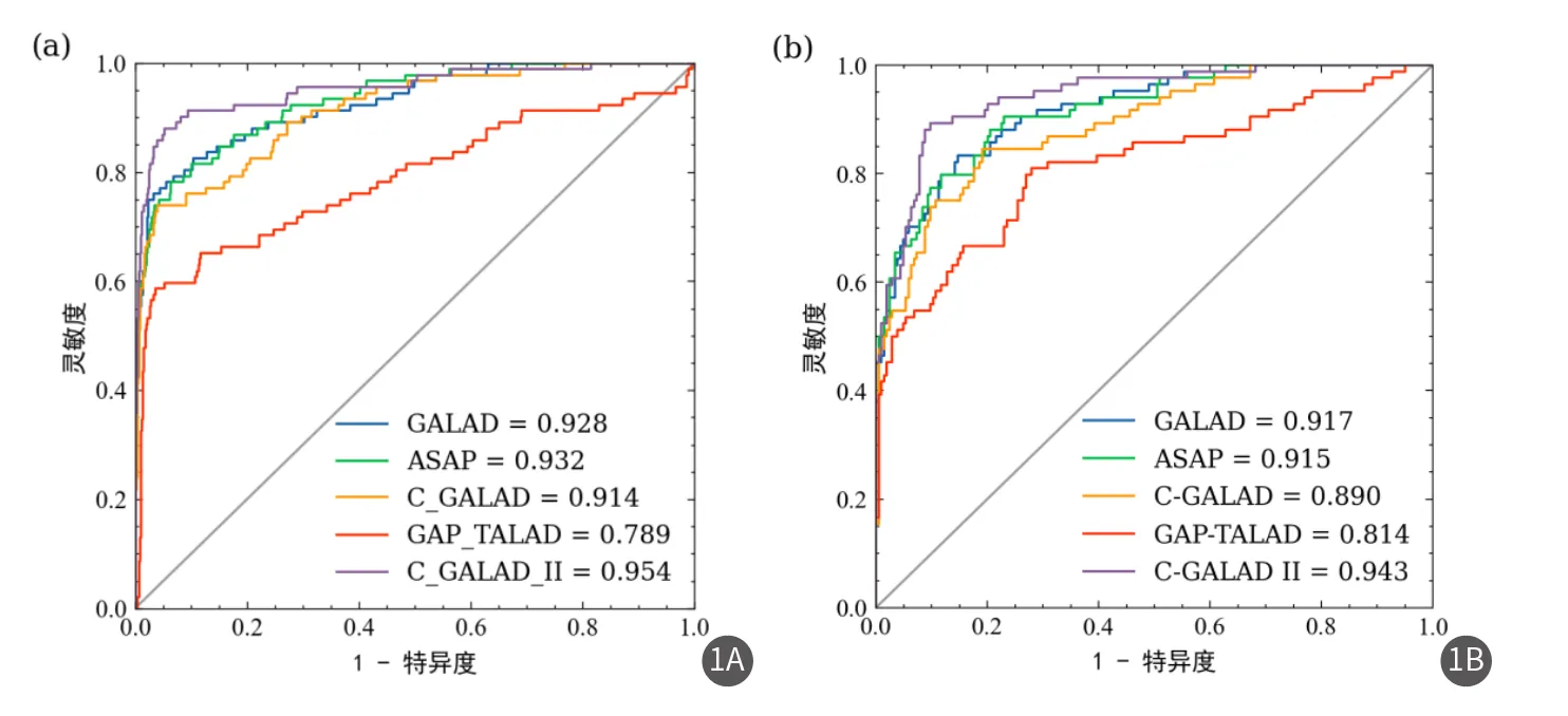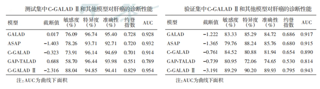 在測試集上驗證C-GALAD Ⅱ所得AUC為 0.954,敏感度為88.04%,特異度為94.85%;在外部獨立驗證集的C-GALAD Ⅱ所得AUC為0.943,敏感度為89.29%,特異度為90.2%,性能優于其他已發表模型。
