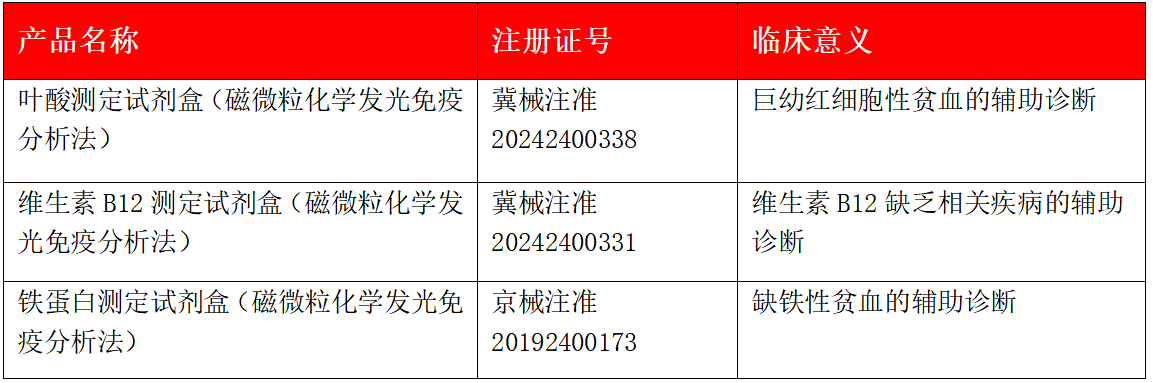 近日,熱景生物研發的葉酸測定試劑盒(磁微粒化學發光免疫分析法)、維生素B12測定試劑盒(磁微粒化學發光免疫分析法),獲得河北省藥品監督管理局批準的醫療器械注冊證。至此,熱景生物貧血三項(FA、VB12和Ferr)全部獲得注冊證,見表1。
