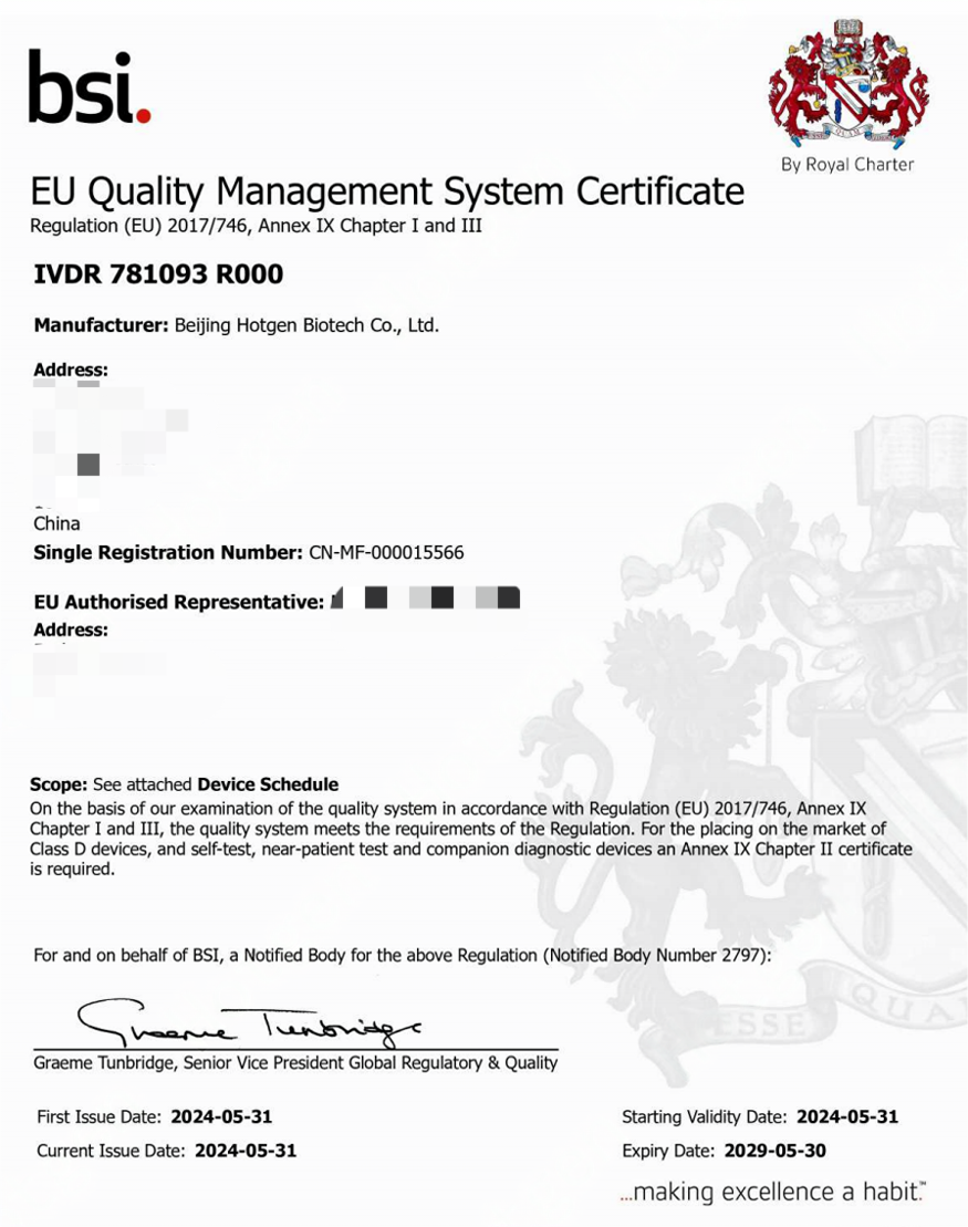 近日,熱景生物在歐盟體外診斷醫療器械法規(IVDR)下新增29款診斷產品的CE認證。該CE IVDR證書由歐洲最有聲望的認證機構之一英國標準協會(BSI)頒發。新批準的29種診斷試劑覆蓋了熱景生物旗下全系列的的免疫檢測產品,包括化學發光、上轉發光、膠體金和酶聯免疫產品線下的B類和C類試劑。這一成果豐富了公司在國際業務板塊的產品解決方案,并進一步提升了市場綜合競爭力,為加速拓展國際市場提供了強有力的抓手。