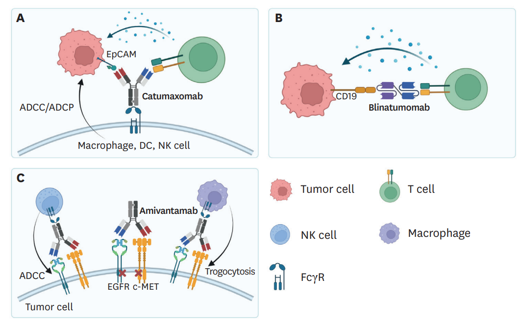 癌癥免疫療法中使用的大多數bsAbs通過T細胞驅動的天然或內源性免疫發揮作用,包括免疫檢查點抑制(CPIs)效應細胞接合器(包括TCE和ICEs)以及共刺激性bsAb。