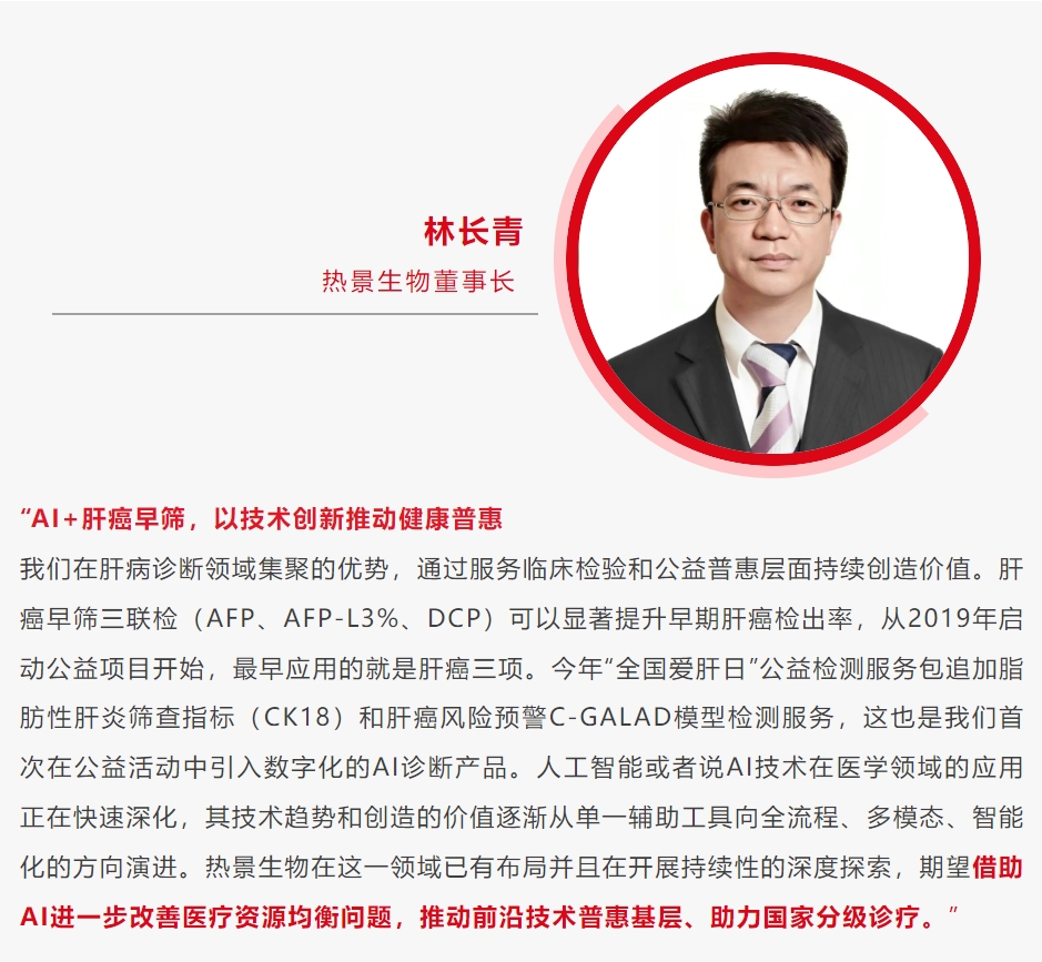 3月18日,值第25個“全國愛肝日”期間,“2025肝癌防治健康中國行——全國愛肝日”大型公益義診活動在全國30省份近百家醫院的協同下聯合展開,惠及近萬人次,公益健康服務包(肝癌三項、GP73、CK18-M30/M65等)由熱景生物支持。2025年升級版“肝病全周期健康檢測服務包”首次融合數智化AI診斷模型,探索“AI+創新診療”公益新模式,通過智能算法提升肝癌篩查效益,助力實現"篩查-診斷-干預"全流程精準管理,全面推動肝癌防治邁入數智化新階段。